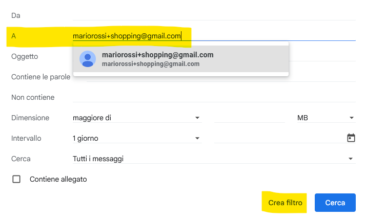 Inviando una mail a mariorossi+shopping@gmail.com o mariorossi+news@gmail.com tutte queste arriveranno a mariorossi@gmail.com.